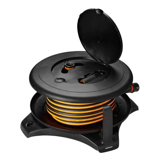 Een handig opbergvak voor accessoires in de haspel is uitgerust met een verstelbaar mondstuk en een kraanaansluiting met meerdere schroefdraad om gemakkelijk te beginnen met water geven.