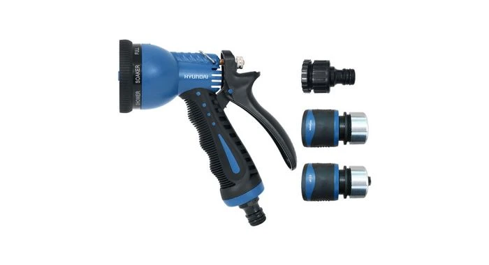 Deze HYUNDAI sproeiset bevat een kraanstuk met adapter, een slangstuk, een slangstuk met waterstop en een deluxe sproeibroes, die eenvoudig op de kraan en slang te bevestigen zijn en is geschikt voor 13 mm (1/2″) en 15 mm (5/8″) slangen.