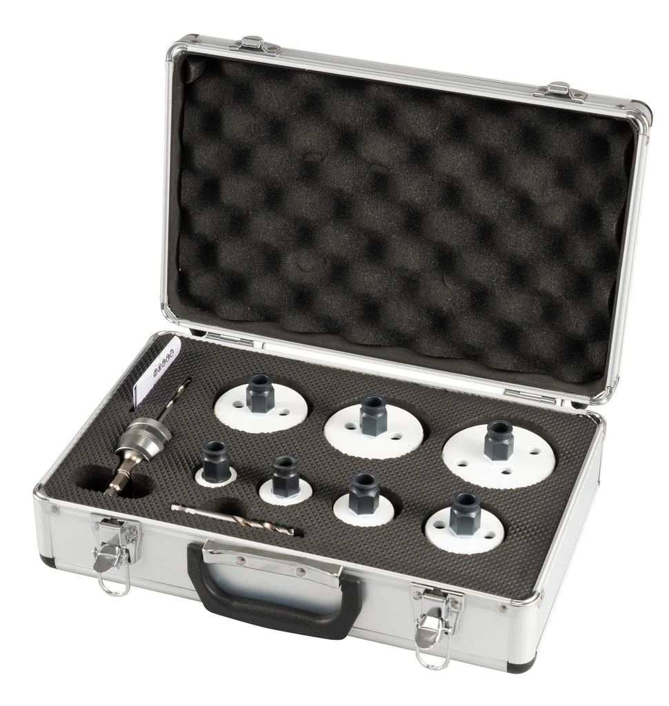Producten zijn ook los verkrijgbaar. Professionele bi-metalen gatzaagset met snelwisselsysteem. 25, 32, 40, 51, 65, 68, 76 mm bi-metalen gatzagen / gatzaaghouder / centreerboor.